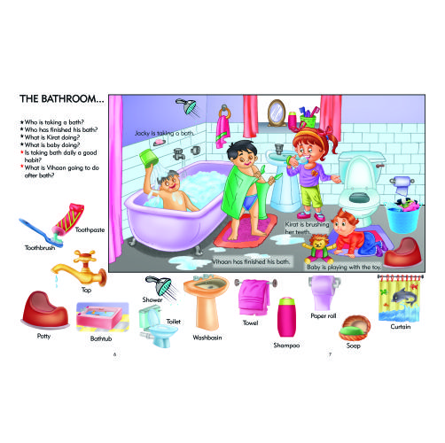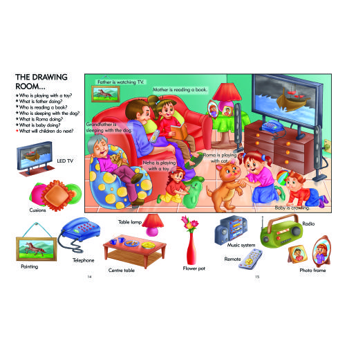 The book introduces 1000 everyday words related to familiar themes such as home, school, animals, food, vehicles, clothes, colors, shapes, and more. Each page encourages children to observe, name, and discuss what they see, making learning both interactive and fun.
