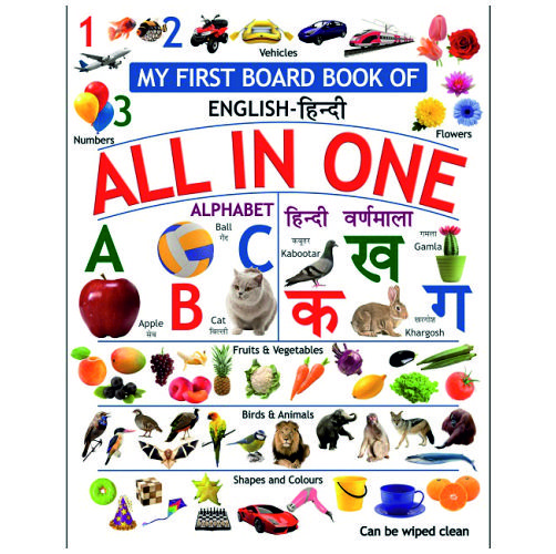 My First Board Book of English and Hindi – All in One is a bright and sturdy learning book specially designed for toddlers and early learners. With colorful pictures and simple words in both English and Hindi, it helps children build early vocabulary in a fun and easy way.